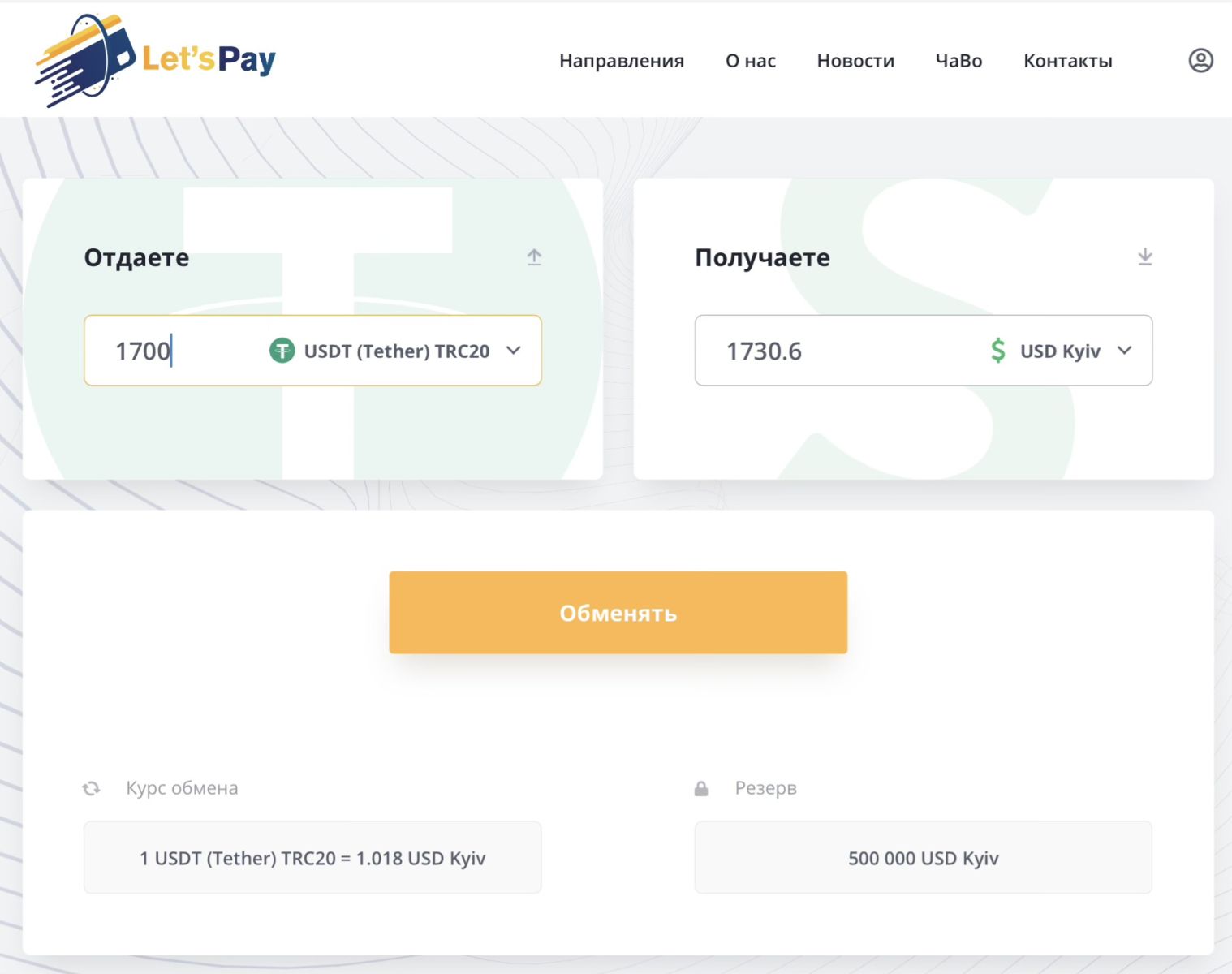 Let’sPay работает на рынке более семи лет и за это время сформировал репутацию одного из самых стабильных и удобных сервисов для обмена криптовалют на гривну. Платформа ориентирована на пользователей, которым нужны быстрые и простые операции без регистрации, сложных процедур KYC и дополнительных технических настроек. Сервис поддерживает основные монеты, с которыми чаще всего работают украинцы: BTC, ETH, LTC, XRP и популярные стейблкоины USDT в сетях TRC20, ERC20, Arbitrum, Polygon, SOL и NEAR. Благодаря этому Let’sPay подходит как для опытных пользователей, так и для тех, кто только начинает работать с криптовалютой и нуждается в понятном инструменте для конвертации активов в гривну.