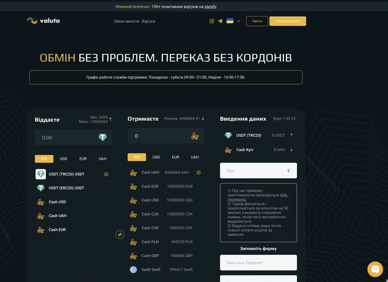 ValutaExchange работает более десяти лет и делает акцент на офлайн-присутствии и стабильной репутации. У платформы есть собственные физические отделения в Киеве, Харькове, Львове, Днепре, Одессе и в нескольких городах Польши. Такая модель обеспечивает высокий уровень доверия, ведь клиенты могут обменять криптовалюту на наличные или получить консультацию в реальных кассах, а не во временных офисах или анонимных чатах.