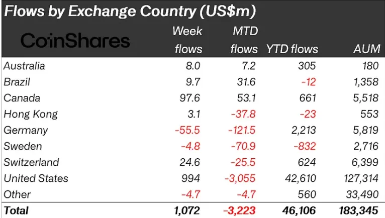 Несмотря на низкую активность торгов ($24 млрд против $56 млрд неделей ранее) через День благодарения, львиную долю притока — $994 млн — обеспечили инвесторы из США. Положительную динамику также показали Канада ($97,6 млн) и Швейцария ($24,6 млн), в то время как Германия зафиксировала заметный отток в $55,5 млн.