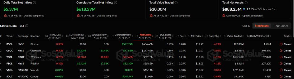 Спотовые биржевые фонды на базе Solana также показали чистый приток в размере $5,37 млн. 28 ноября. Лидерами здесь стали фонд GSOL от Grayscale ($4,33 млн.) и FSOL от Fidelity ($2,42 млн.). Общий объем AUM Solana-ETF составляет $888,25 млн.