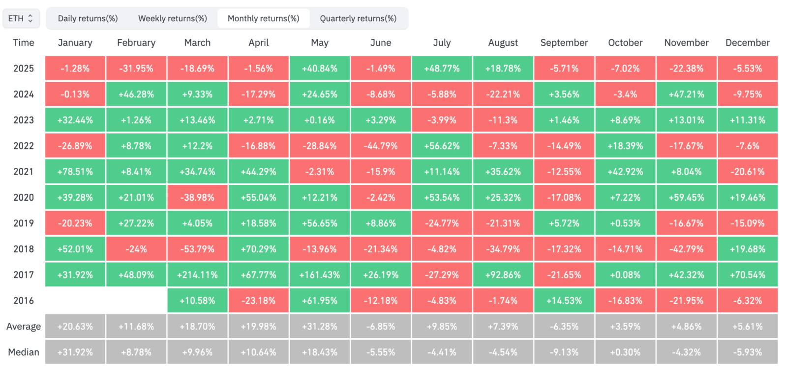 Это падение особенно нетипичным, поскольку исторически для второй по капитализации криптовалюты ноябрь чаще заканчивался ростом. Таким образом, результат 2025 значительно повлиял на долгосрочную статистику.