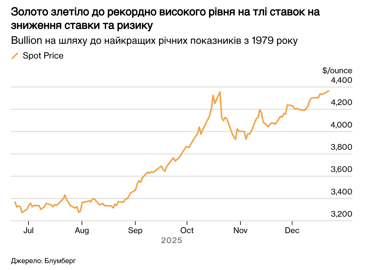 Цена на золото превысила $4 380 за унцию, показав лучшие годовые результаты более чем за 40 лет. Об этом пишет Вloomberg.
