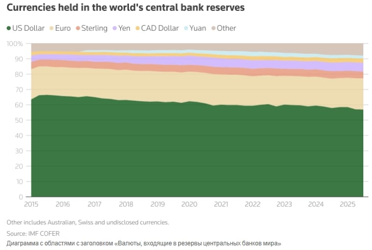 В третьем квартале 2025 года доля доллара в мировых валютных резервах уменьшилась
