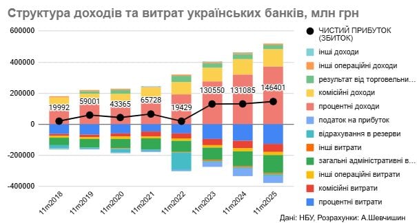 Банковская система удерживает статус самого прибыльного сектора экономики уже три года подряд. За 11 месяцев 2025 года украинские банки получили 146,4 млрд грн чистой прибыли. Об этом сообщил финансовый аналитик Андрей Шевчишин на своей странице в Facebook 23 декабря.