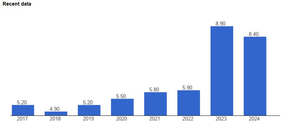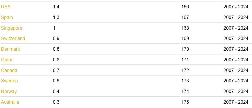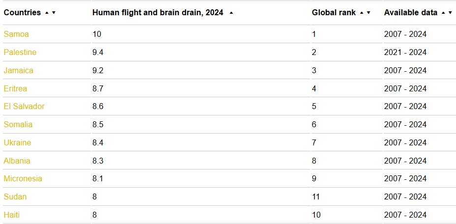 Исторический контекст: Для Украины средний показатель за период с 2007 по 2024 год составляет 6,26 балла. Самый низкий уровень оттока мозгов (brain drain) был зафиксирован в 2018 году (4,9 балла), что практически соответствовало тогдашней мировой норме.