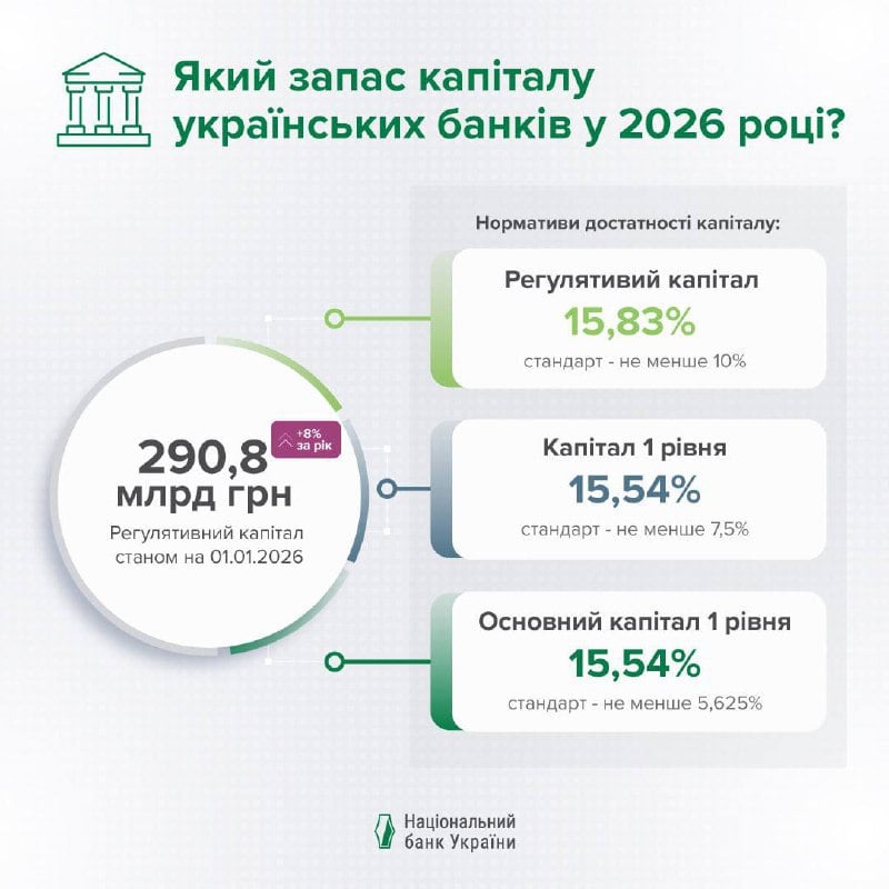 Как свидетельствуют данные по значениям пруденциальных нормативов по системе банков на 1 января 2026 года, регулятивный капитал составляет 290,8 млрд грн, что на 22 млрд грн или на 8% выше показателя на 1 января 2025 года.