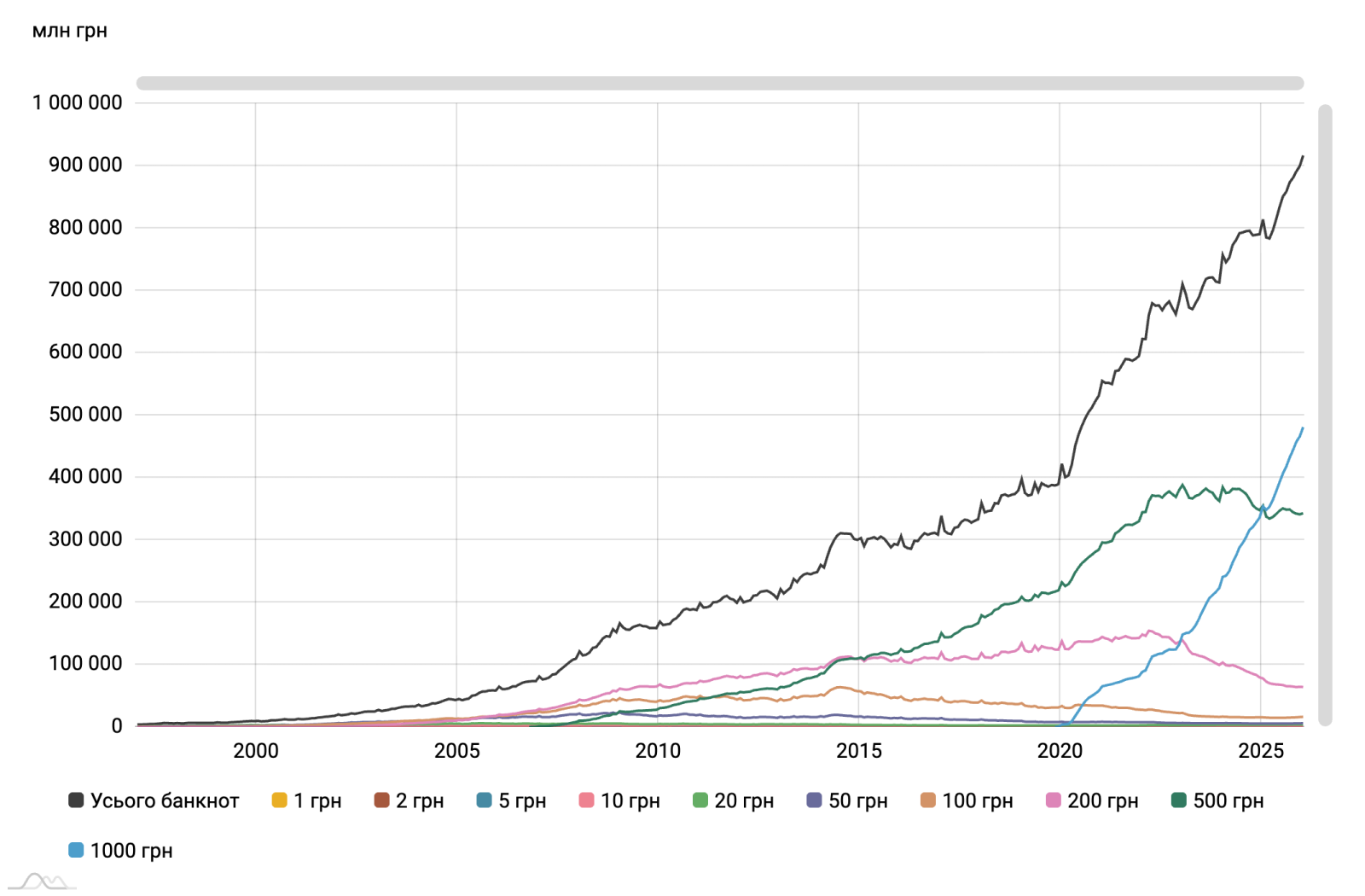 За 2025 впервые за последние годы в обращении увеличилось количество банкнот номиналами 100 и 50 гривен (на 4,5% и 6,3% соответственно по сравнению с началом года). Это может быть следствием изменения тарифной политики НБУ, направленной на повышение разменности денежных знаков.