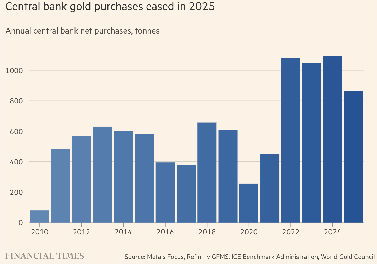 По данным отраслевой организации World Gold Council (WGC), в прошлом году объемы покупки золота центральными банками и другими учреждениями, такими как суверенные фонды и государственные органы, сократились до 863,3 тонны, поскольку высокие цены и рост стоимости существующих запасов удержали спрос на дальнейшую покупку со стороны официального сектора.