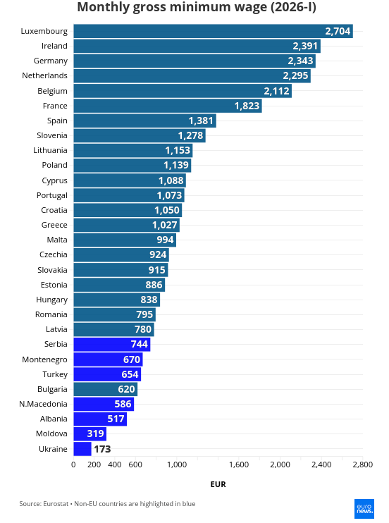 Диапазон минимальных зарплат в странах ЕС колеблется от €620 в Болгарии до €2 704 в Люксембурге. Если же учитывать страны-кандидаты на вступление в ЕС, то самый низкий показатель фиксируется в Украине (€173) и Молдове (€319).