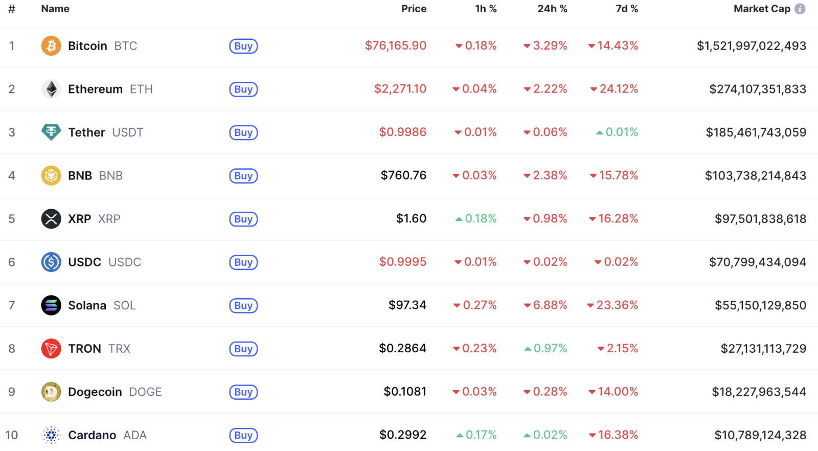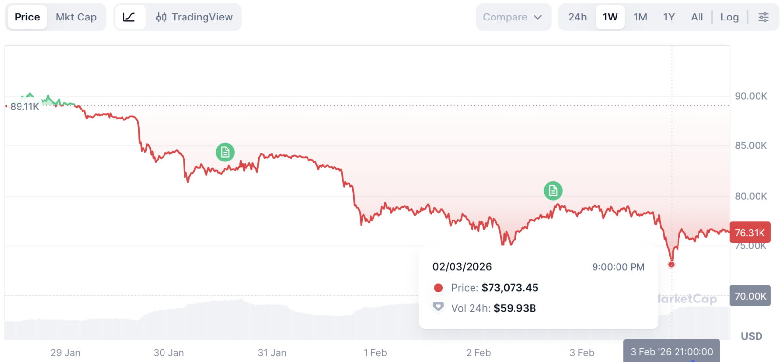 Вчера вечером, 3 февраля, биткоин в моменте опустился до $73 073 — уровня начала ноября 2024 года, когда актив торговался по $68 898. К моменту написания новости цена первой криптовалюты составляет $76 165. Об этом свидетельствуют данные CoinMarketCap.