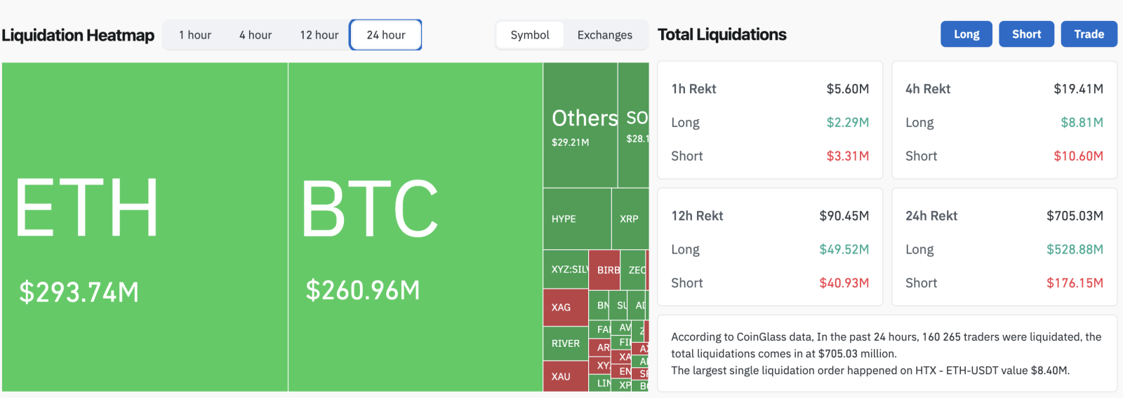По данным CoinGlass, в сутки объем ликвидаций на рынке фьючерсов составил $705 млн. Под принудительное закрытие позиций попали более 160 тысяч трейдеров.