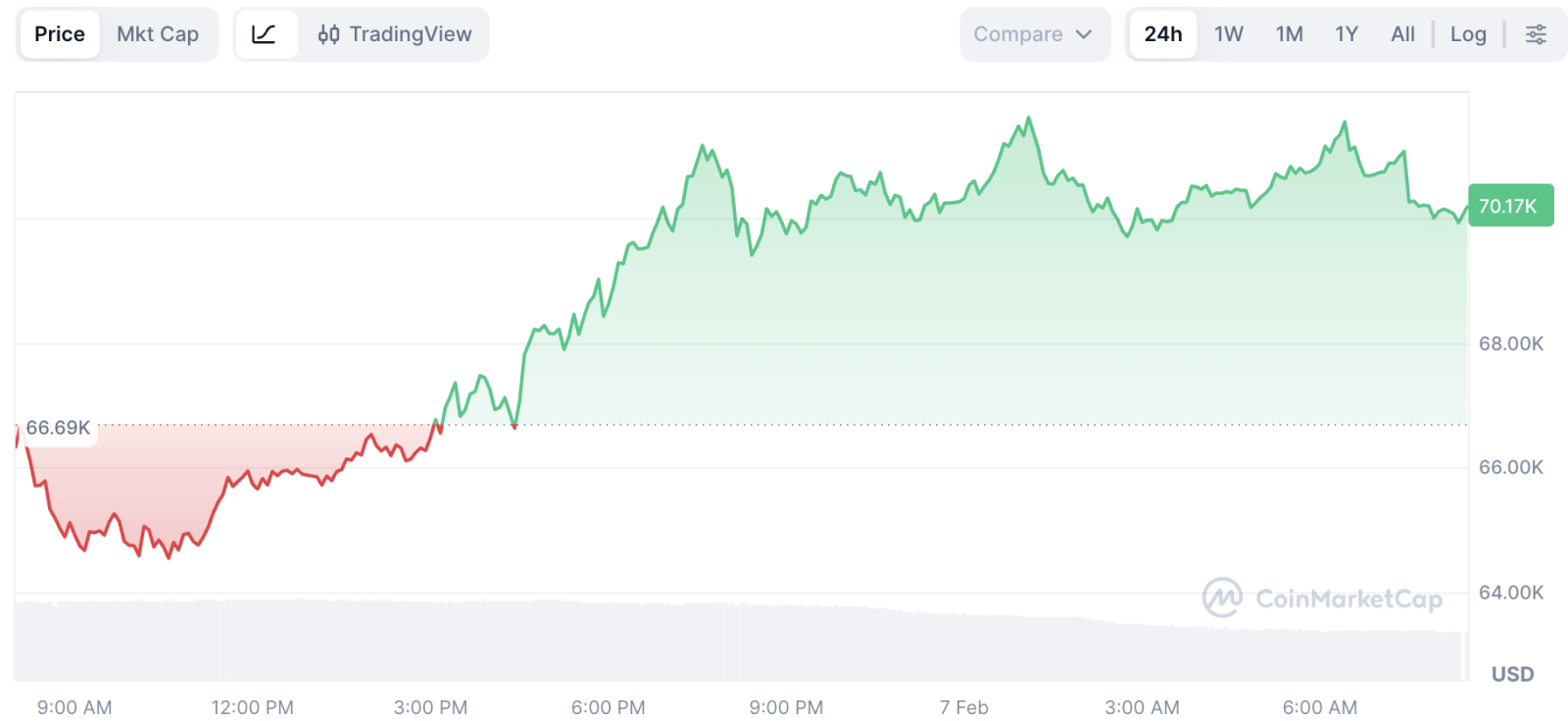 На момент написания новости цена первой криптовалюты достигла $70 175. За последние 24 часа актив прибавил 6,68%. Однако недельное падение составляет около 16%. Отметим, что в октябре 2025 года биткоин достиг пиковых значений в $126 080.