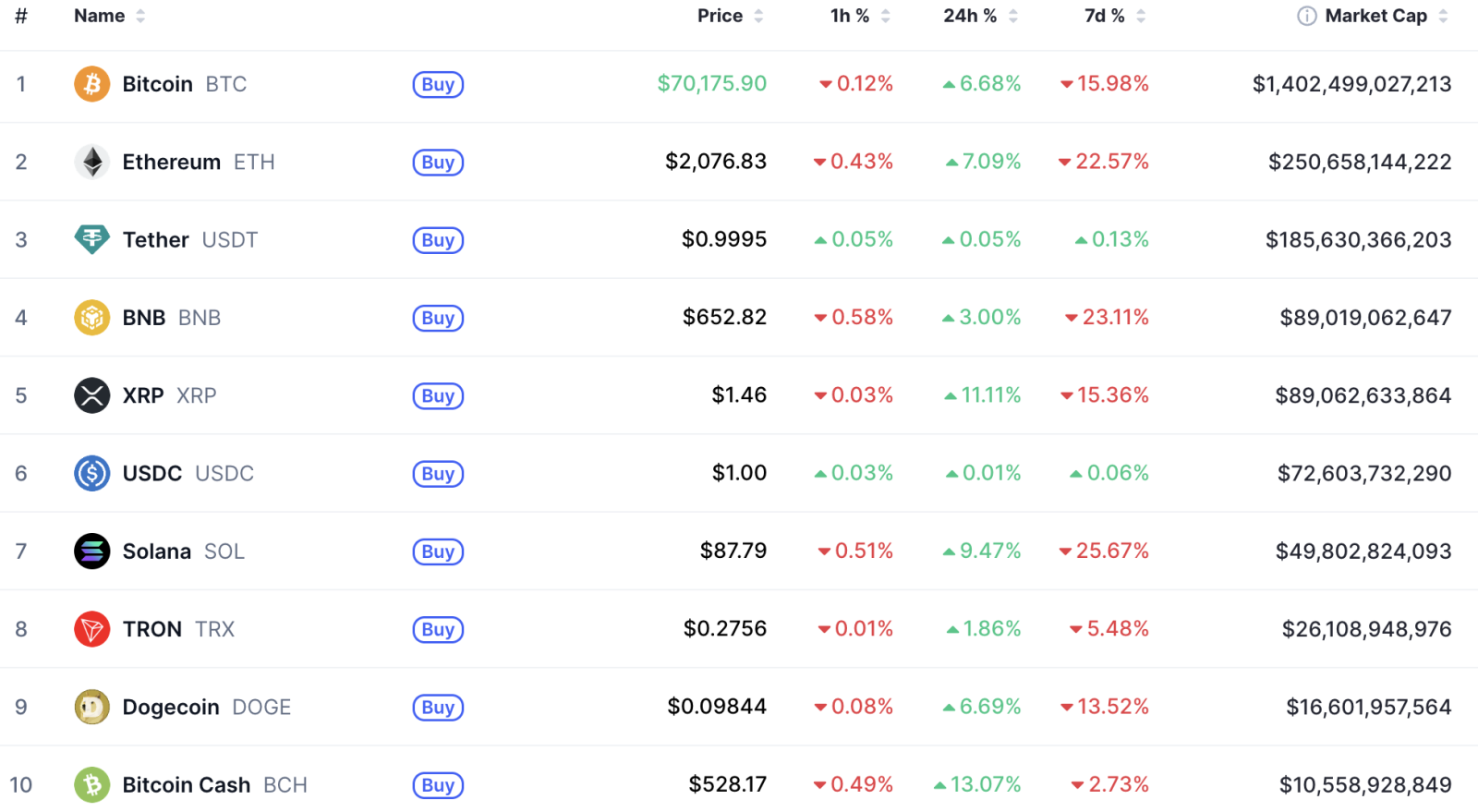 Крипторынок в «зеленой» зоне: биткоин восстановился до $70 000