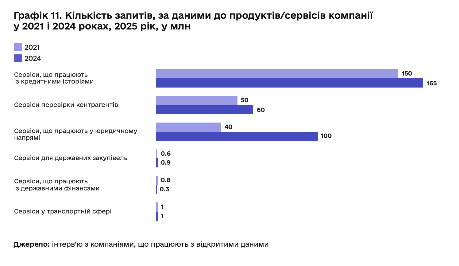 Компании, работающие с кредитными историями и риск-анализом (например, Украинское бюро кредитных историй), зафиксировали увеличение количества запросов более чем на 10% (со 150 млн запросов в 2021 году до 165 млн в 2024 году). Об этом говорится в отчете, подготовленном Институтом экономических исследований и политических консультаций (ИЭД) совместно с InfoSapiens по заказу Texty.org.ua для Министерства цифровой трансформации Украины.