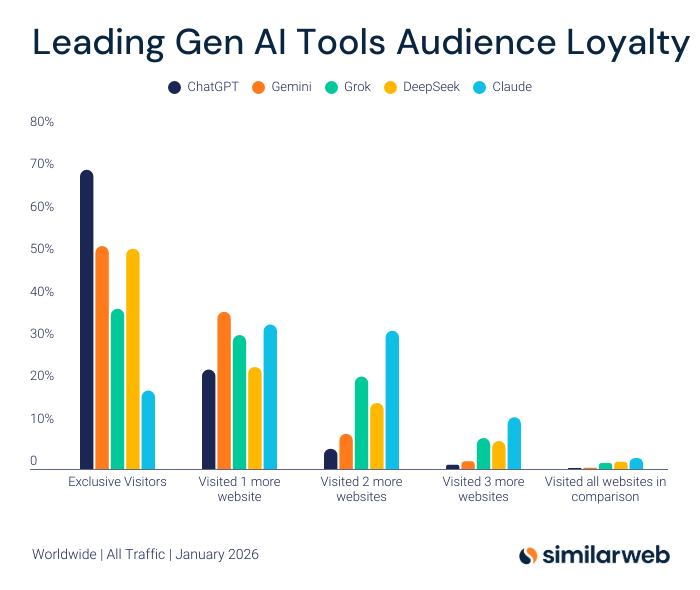Согласно данным о перекрестном использовании (cross-browsing) мобильных приложений, ChatGPT имеет самую лояльную и эксклюзивную аудиторию среди всех конкурентов. Около 68% его пользователей не посещают никаких других ИИ-сайтов или приложений. Достаточно высокий уровень лояльности (около 50% эксклюзивных пользователей) также демонстрируют приложения Google Gemini и DeepSeek.