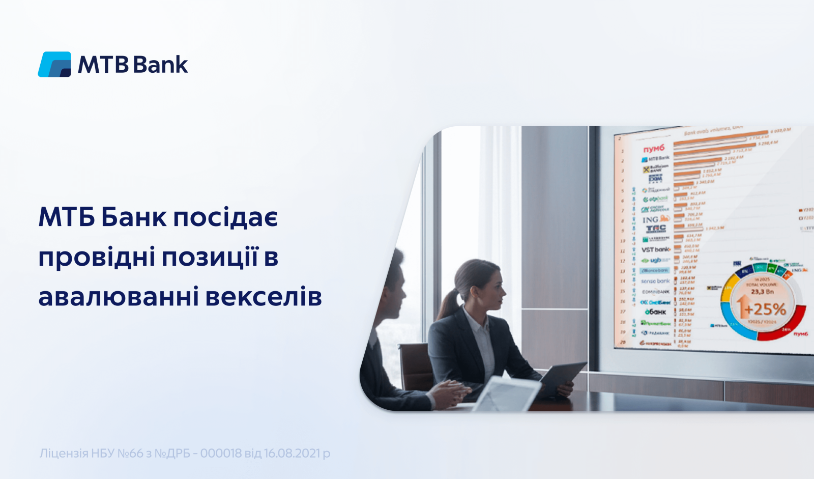По итогам 2025 МТБ Банк занял 2 место среди банков Украины по объемам авалирования. Объем сделок составил 5,3 млрд грн, что на 42,6% больше, чем в 2024 году.