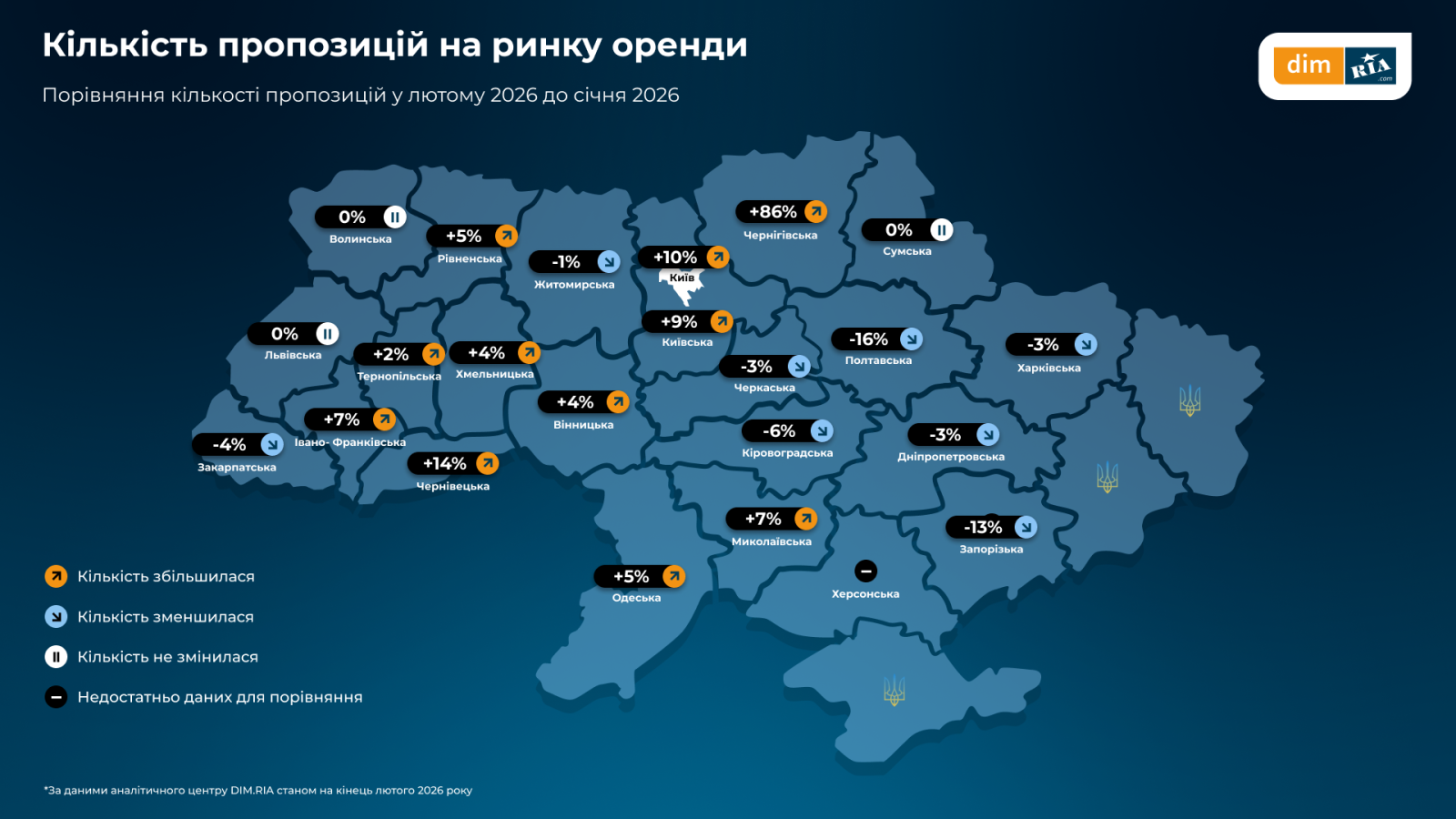 По данным маркетплейса DIM.RIA наибольшее количество объявлений об аренде жилья в феврале появилось в Черниговской области — +86%. Наиболее заметное уменьшение предложений наблюдалось в Полтавской области (-16%). Общая ситуация по стране демонстрирует колебания в пределах нескольких процентов в зависимости от региона.