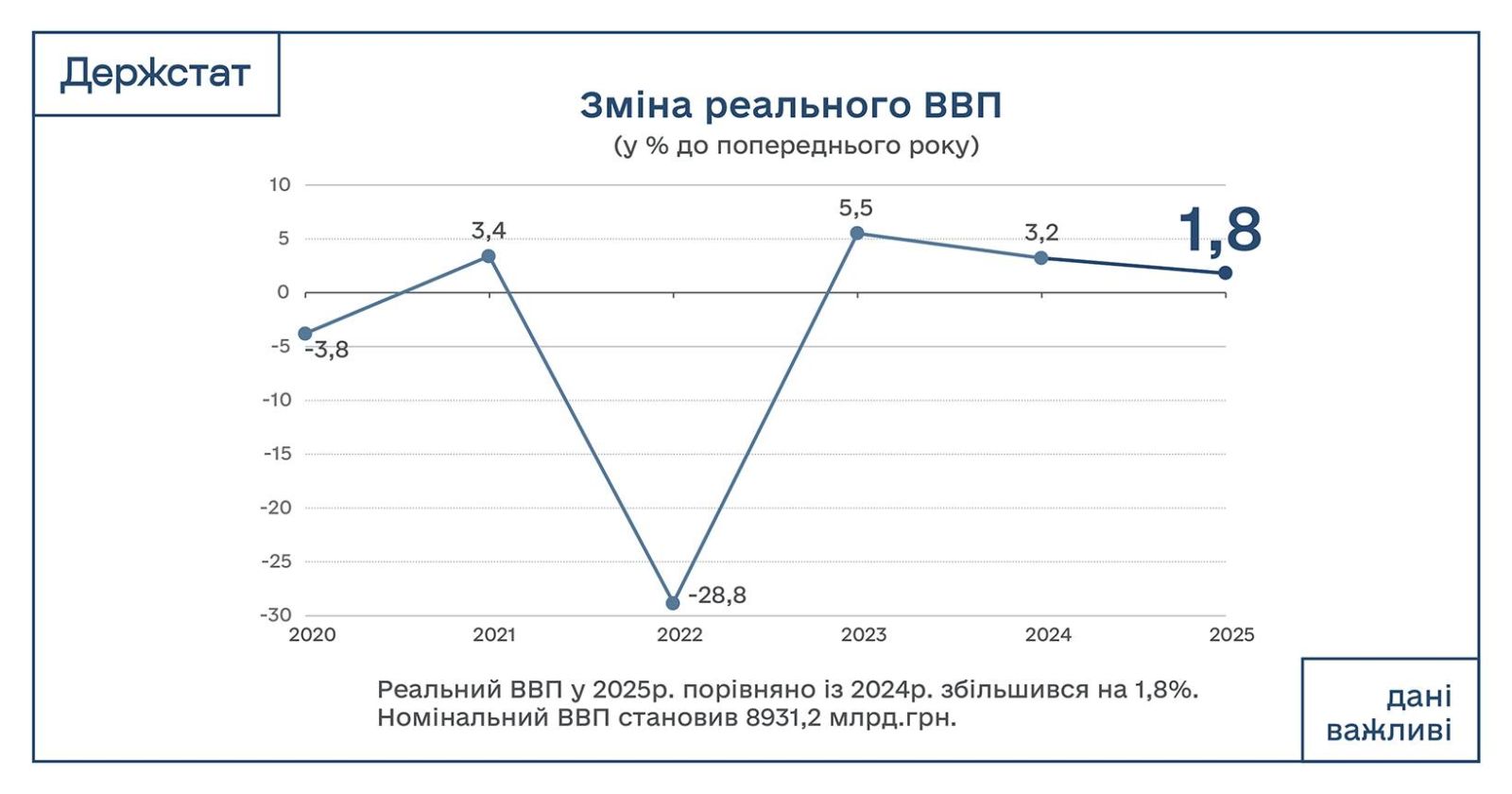 Реальный ВВП Украины в 2025 году вырос на 1,8% — Госстат