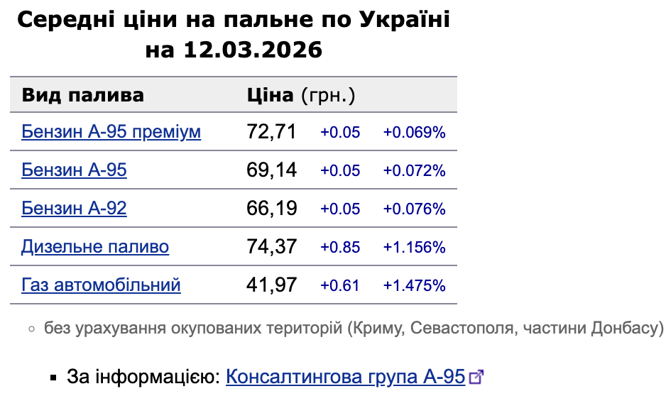 В четверг, 12 марта, средняя стоимость горючего на украинских АЗС продолжает идти вверх. Пока цены на бензин держатся относительно стабильно, другие виды топлива демонстрируют уверенный рост. Об этом сообщает «Минфин» со ссылкой на данные Консалтинговой группы «А-95».