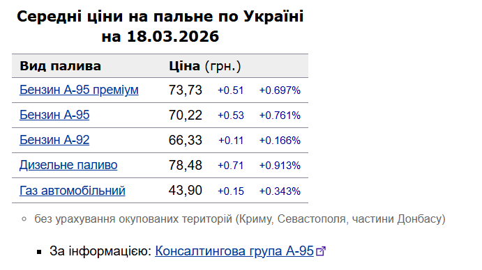 - А-95 (премиум) — 73,73 грн/л (дорожал на 51 коп.)