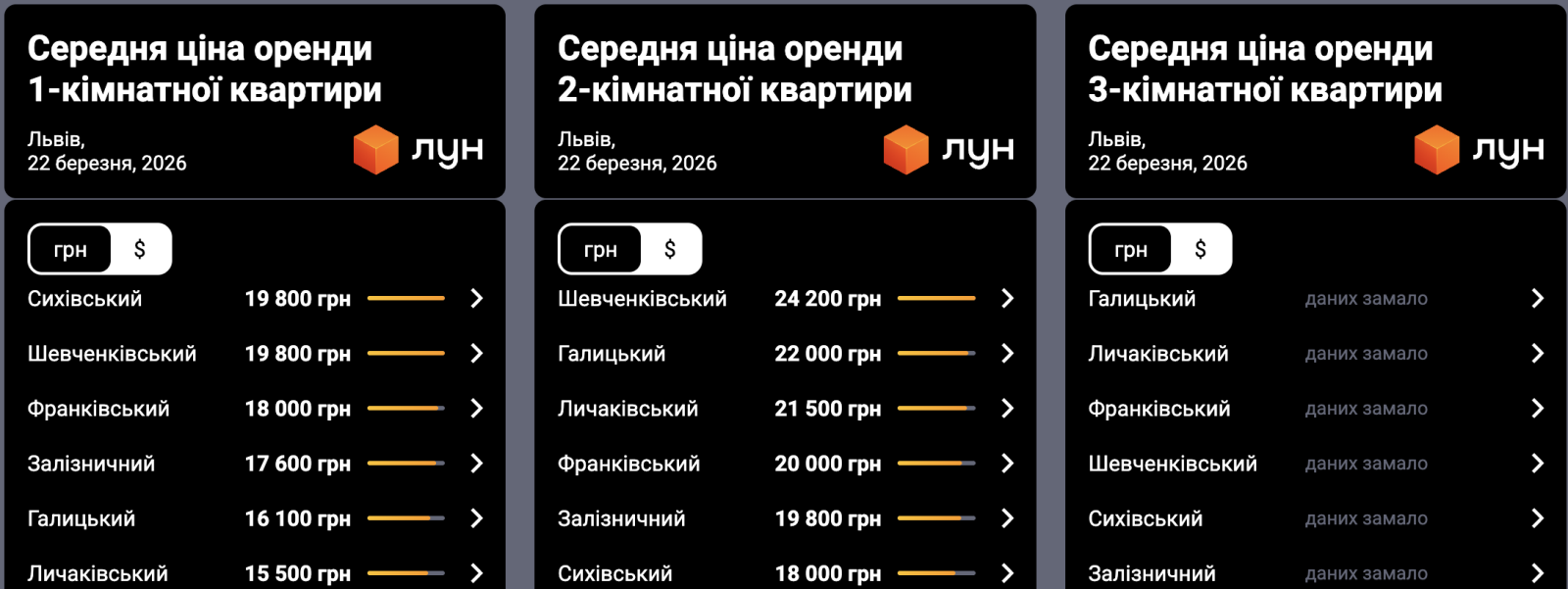 В Галицком районе аренда обойдется в 22 000 грн, в Лычаковском — 21 500 грн, во Франковском — 20 000 грн, Железнодорожном — около 19 800 грн.
