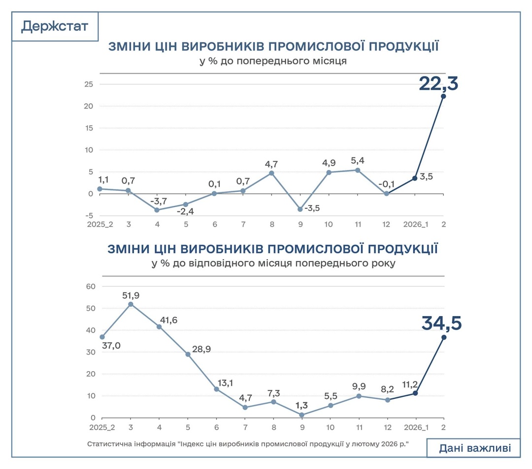 «В феврале 2026 года зафиксирован резкий рост цен производителей промышленной продукции, который имеет признаки разового, нетипичного отклонения: +22,3% по сравнению с предыдущим месяцем; +34,5% в годовом исчислении (по сравнению с февралем 2025 года)», — говорится в сообщении.