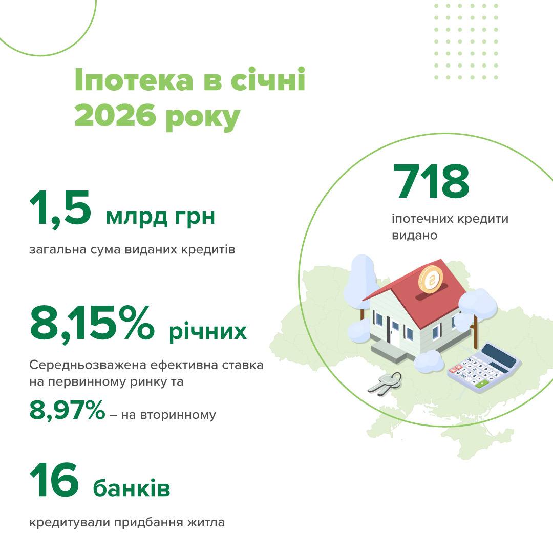 В январе 2026 года банки Украины выдали 718 ипотечных кредитов на общую сумму 1,5 млрд грн. Об этом свидетельствуют данные ежемесячного опроса банков об ипотечном кредитовании, сообщает пресс-служба Национального банка.
