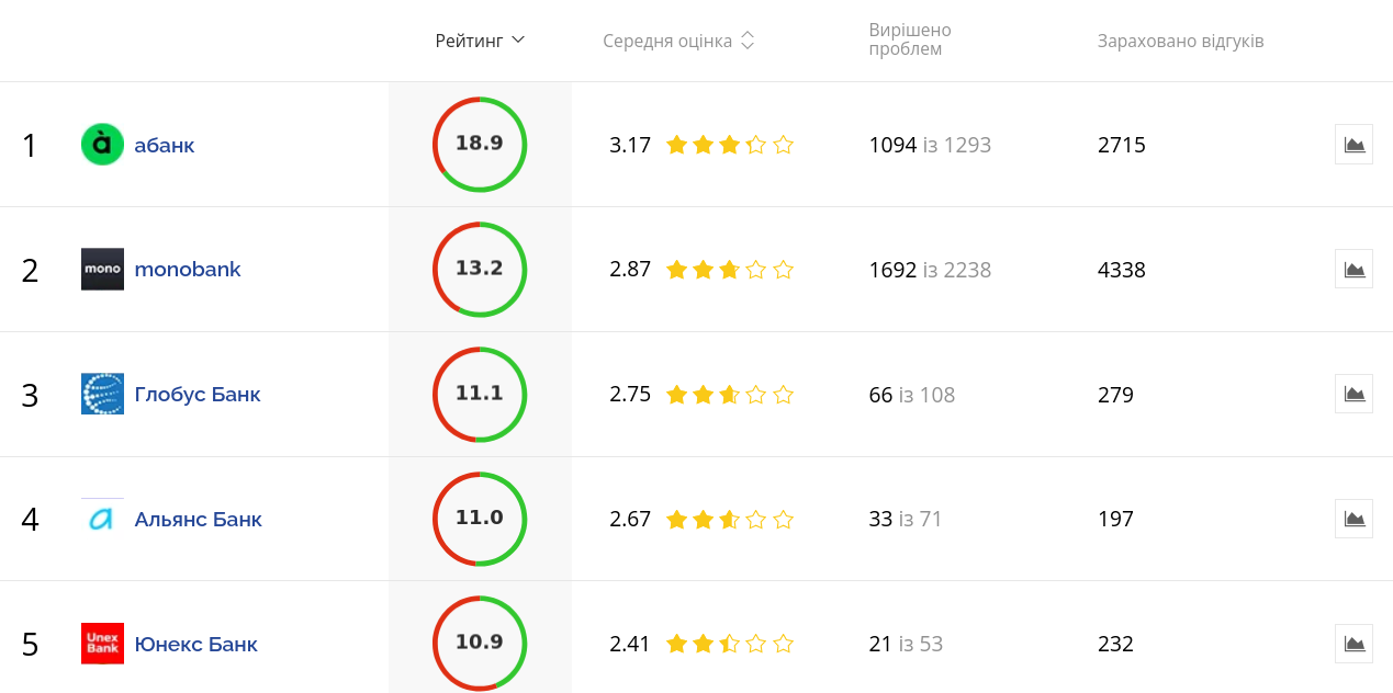 Второе место — monobank, а третье место занял Глобус банк. В первую пятерку также вошли Альянс Банк и Юнекс Банк.