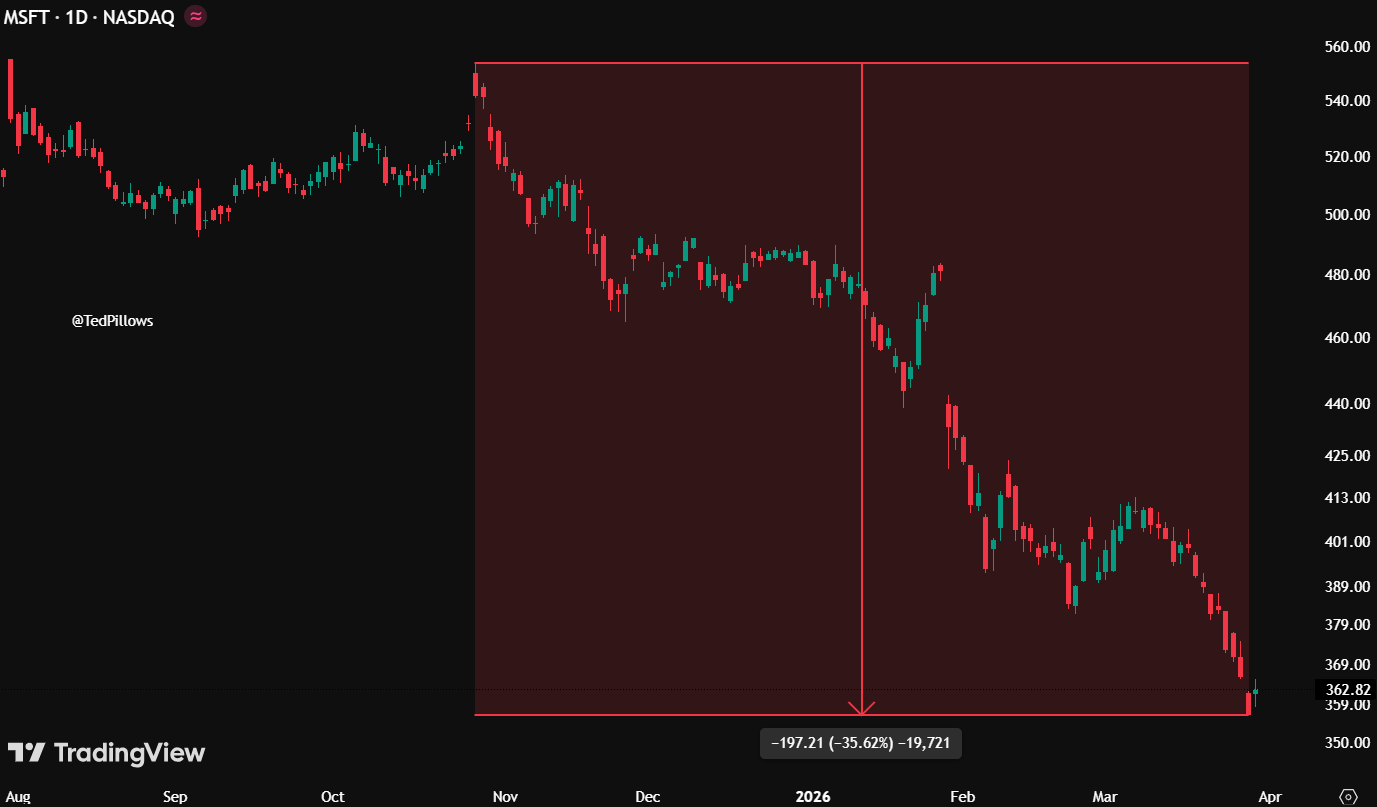 Согласно данным дневного графика на бирже NASDAQ, который опубликовал в социальной сети X трейдер Тед Пилоуз, обвал носил системный и стремительный характер. Отображенный на графике период охватывает отрезок с августа по апрель с переходом в 2026 год, где шкала цен колеблется в диапазоне от $350 до $560 за акцию.