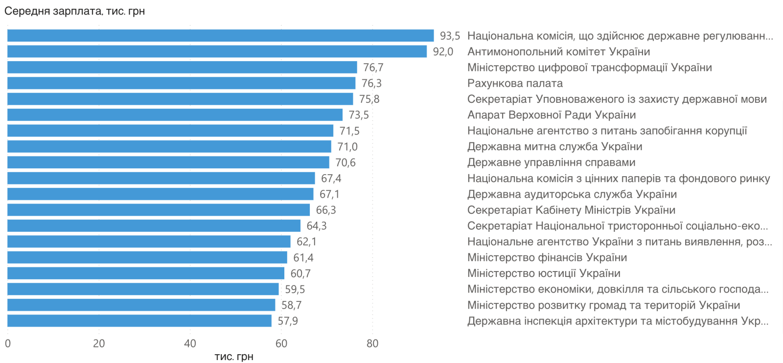 В первую десятку также вошли Аппарат Верховной Рады (73,5 тыс. грн), НАПК (71,5 тыс. грн) и Государственная таможенная служба (71,0 тыс. грн).