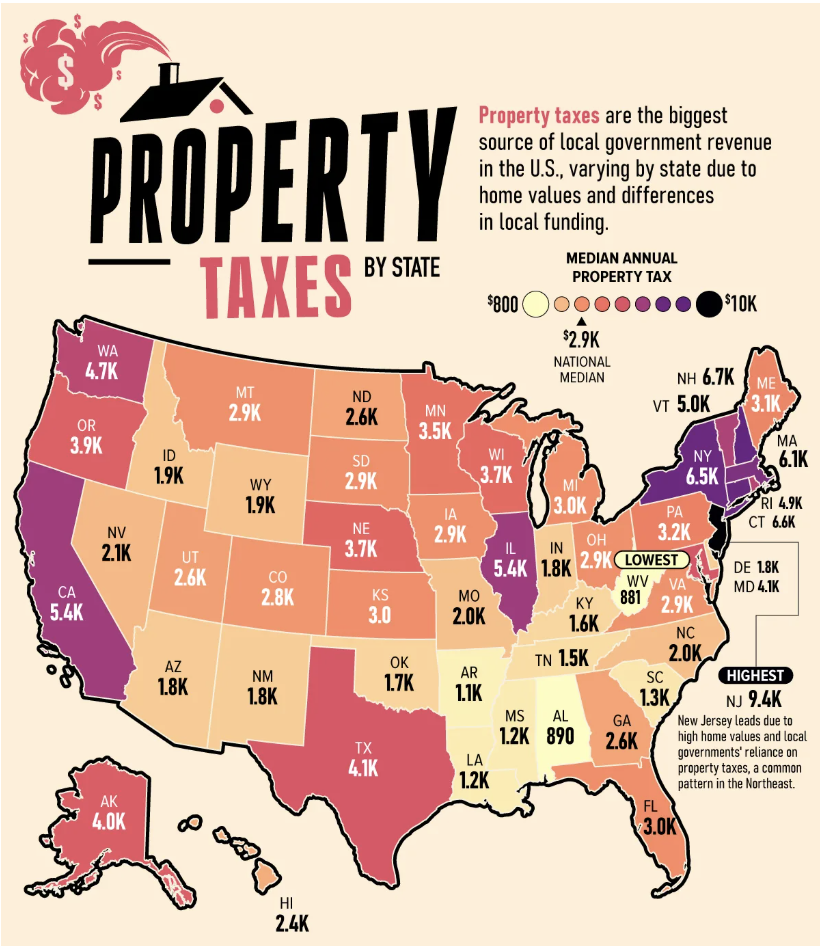 Счет о налоге на имущество отличается более чем в 10 раз в штатах США. Нью-Джерси имеет самый высокий средний счет — 9358 долларов, тогда как Западная Вирджиния (881 доллар) и Алабама (890 долларов) являются самыми низкими