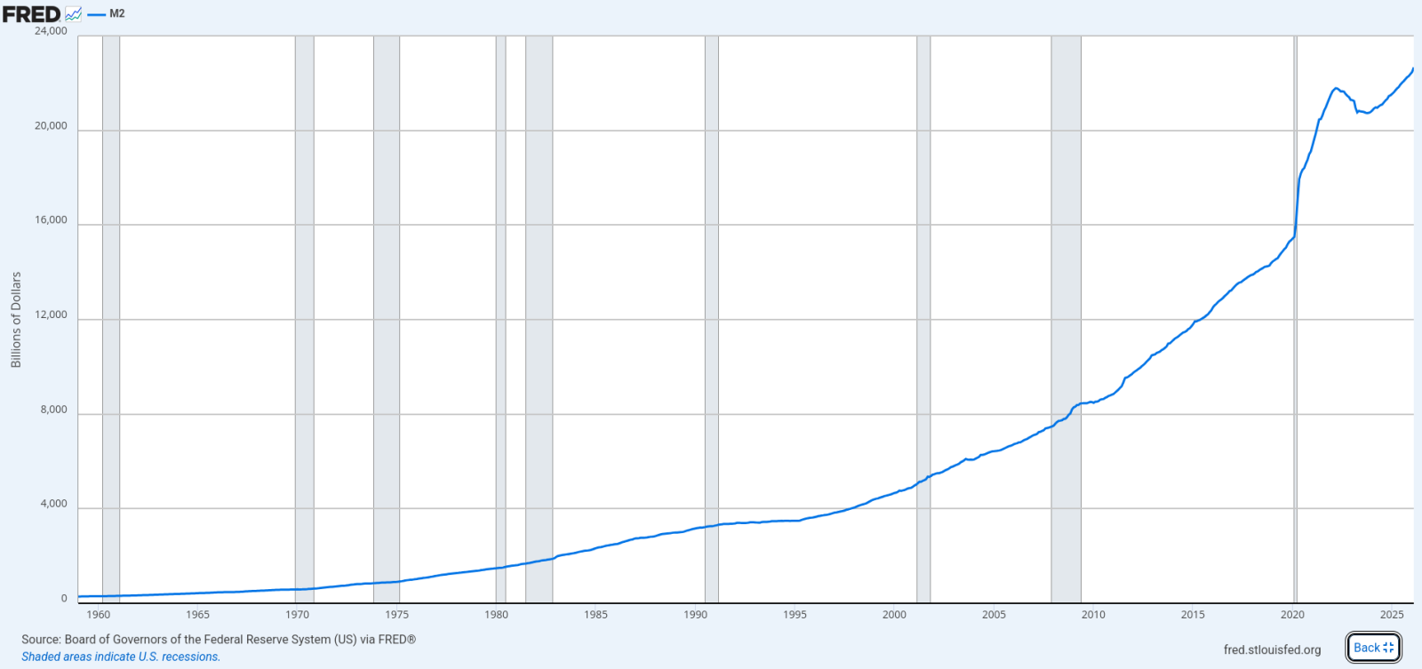 Анализ многолетнего графика Федеральной резервной системы (FRED) демонстрирует стремительную девальвационную спираль. Исторически денежная масса США росла умеренными темпами, однако в 2020 году произошёл беспрецедентный вертикальный скачок — следствие агрессивного стимулирования во время пандемии.