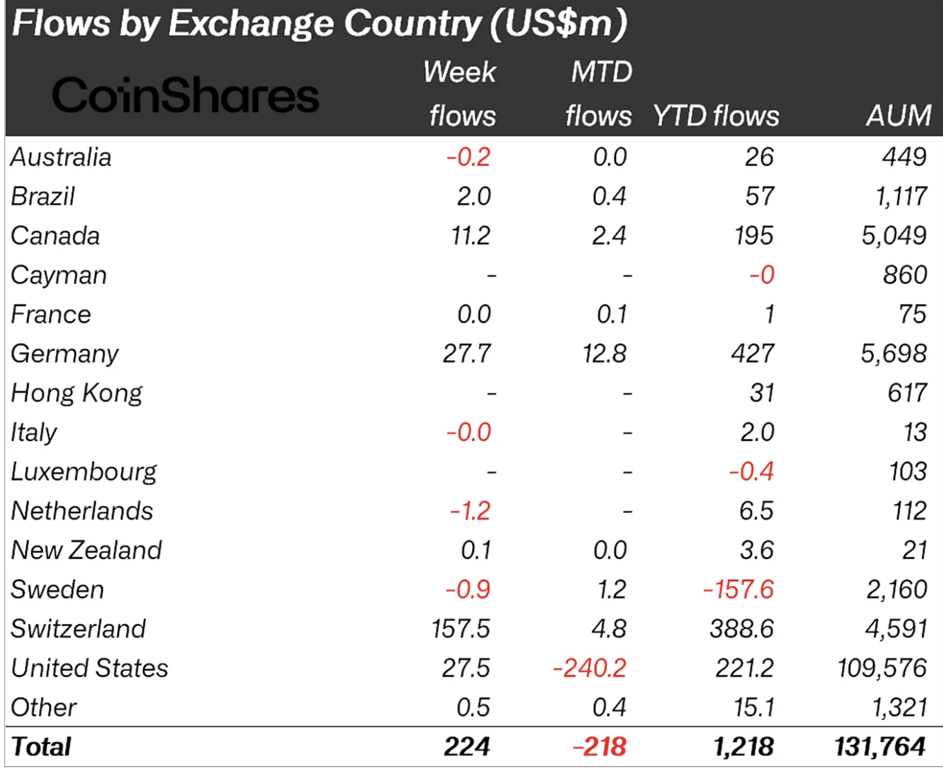 Интересной особенностью недели стало географическое распределение капитала. Пока активность в США остается сдержанной ($27,5 млн.), основным центром притока средств стала Швейцария, обеспечившая $157,5 млн. Также положительную динамику продемонстрировали Германия и Канада.
