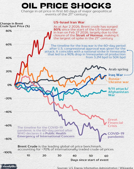 Исторический анализ реакции нефтяного рынка на геополитические события свидетельствует о четкой закономерности: любая угроза физическим поставкам сырья мгновенно толкает цены вверх. Однако динамика текущего кризиса оказалась совершенно аномальной. С начала военных действий 27 февраля 2026 года эталонная марка нефти Brent (которая определяет ценообразование для около 70% всей нефти, торгуемой в мире) продемонстрировала вертикальный скачок. По состоянию на 2 апреля — всего на 34-й день конфликта — котировки выросли на 80%.