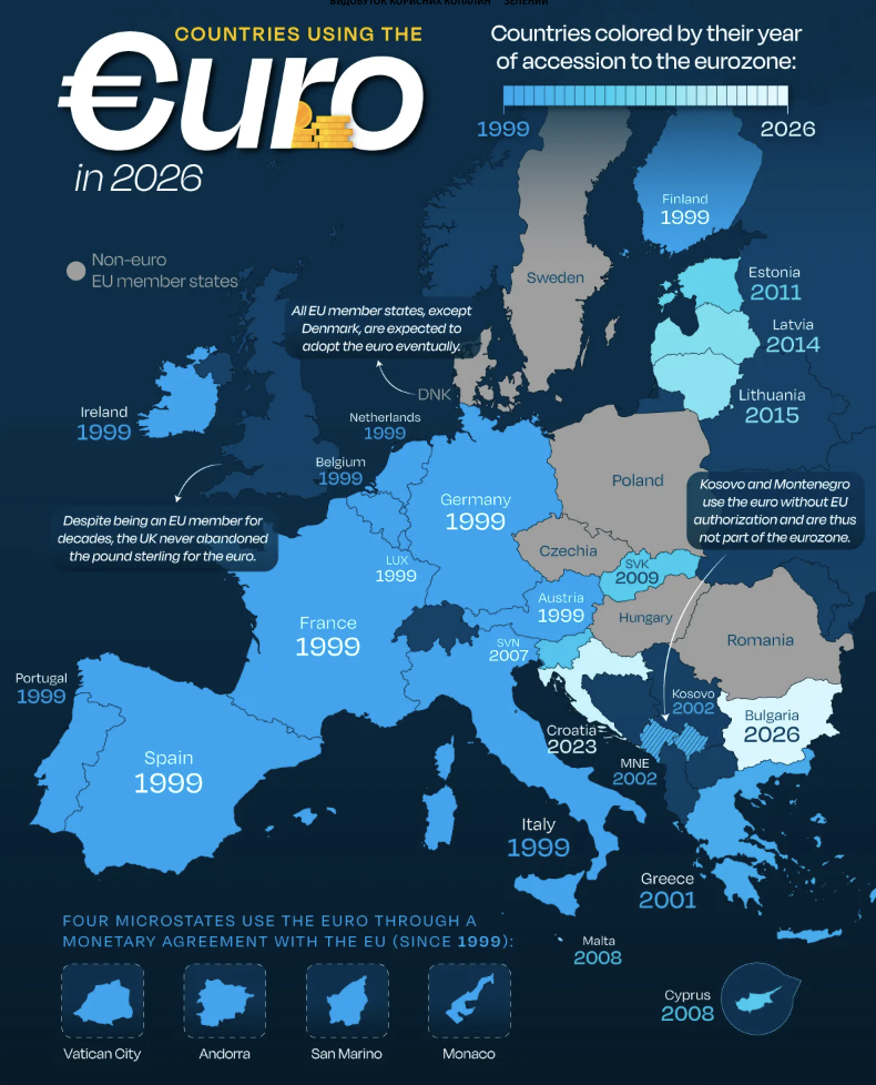 В январе 2026 года Болгария стала 21-м членом еврозоны, что стало первым расширением валютного блока с момента присоединения Хорватии в 2023 году.