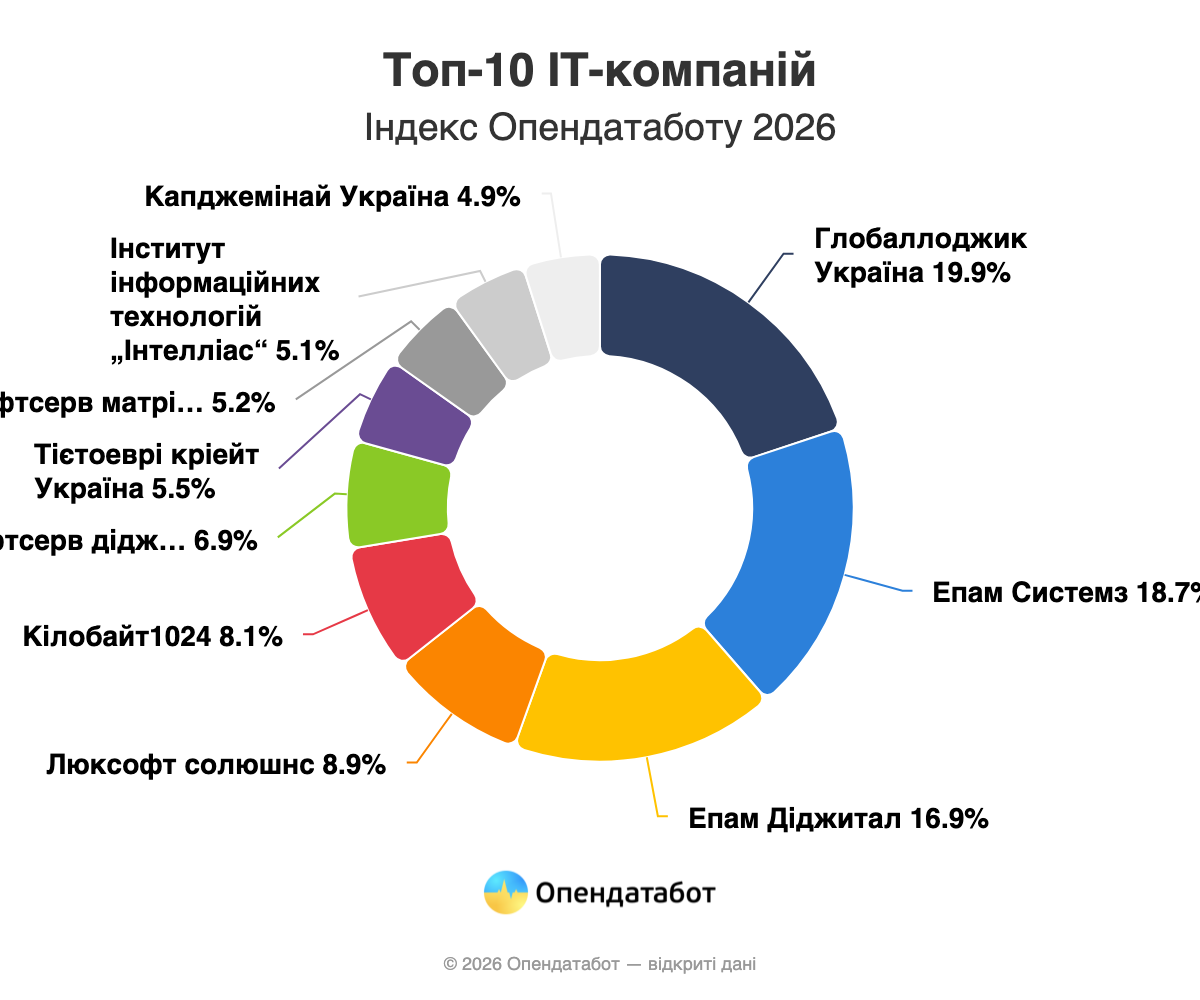 54,67 млрд грн дохода получила десятка крупнейших ИТ-компаний Индекса Опендатабота 2026 года. Это на 3% меньше, чем годом ранее. Тем не менее, «входной билет» в топ-10 почти не изменился: если в 2025 году он составлял 2,6 млрд грн, то в 2026-м — 2,69 млрд грн.