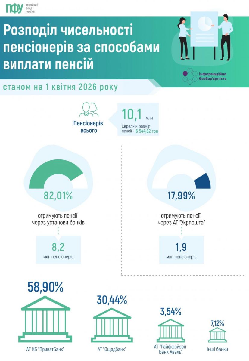 В Украине большинство пенсионеров получают выплаты через банки. По состоянию на 1 апреля 2026 года из 10,1 млн пенсионеров 82,01% (8,2 млн человек) пользуются банковскими учреждениями, тогда как 17,99% (1,9 млн) получают пенсии через «Укрпочту». Об этом свидетельствуют данные Пенсионного фонда Украины.