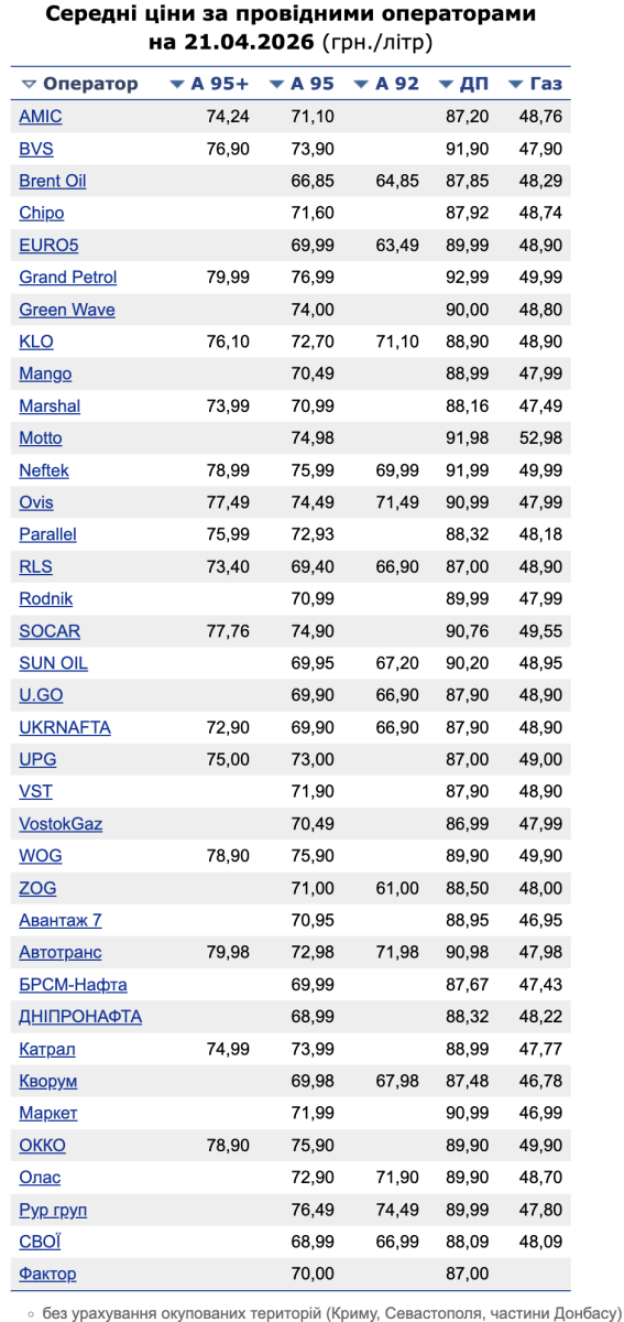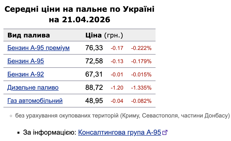 Во вторник, 21 апреля, на украинских заправках продолжается постепенное понижение цен. Наибольшую динамику снова демонстрирует дизельное топливо, в то время как стоимость бензинов меняется менее активно. Об этом сообщает «Минфин» со ссылкой на данные Консалтинговой группы «А-95».