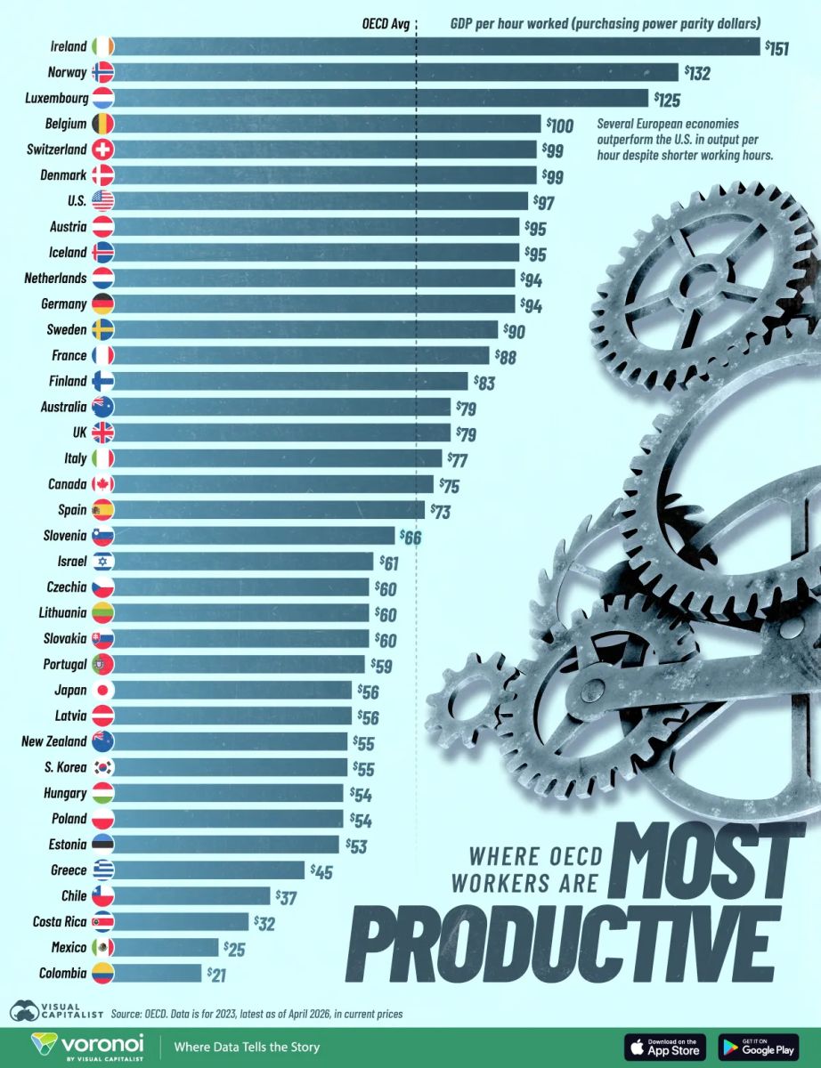 Эффективность труда в разных странах существенно отличается. По данным ОЭСР, лидером ВВП на час стала Ирландия — $151. Впрочем, аналитики предостерегают: этот показатель в значительной степени обусловлен деятельностью транснациональных корпораций. Об этом сообщает VisualCapitalist.