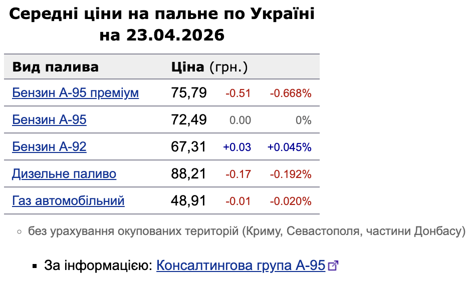Цены на топливо 23 апреля: бензин премиум-класса и дизель продолжают дешеветь