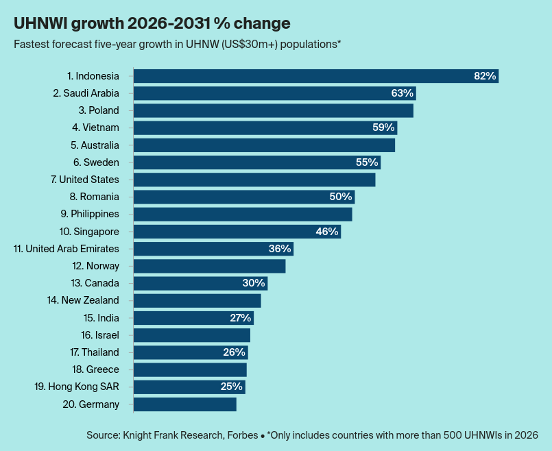 Прогноз на ближайшие пять лет (2026−2031) показывает, что лидерами по темпам роста числа сверхбогатых людей станут не традиционные финансовые центры, а быстро развивающиеся экономики. Возглавляет рейтинг Индонезия с прогнозируемым ростом на 82%. За ней следуют Саудовская Аравия (63%), Польша и Вьетнам (59%).