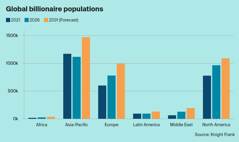 Совокупность мировых миллиардеров, насчитывающая 3 110 человек, в настоящее время более географически рассредоточена по сравнению с более широкой группой мультимиллионеров. Аналитики ожидают, что эта тенденция к диверсификации сохранится, а темпы роста будут сильно различаться в зависимости от региона. В частности, ожидается, что в одной из исследуемых стран количество миллиардеров вырастет на 77% в период между 2026 и 2031 годами.