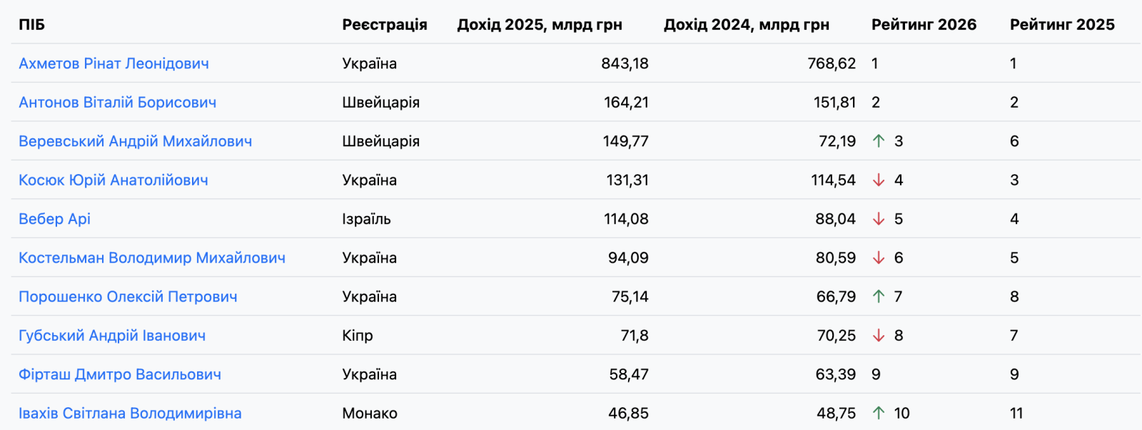 Абсолютным лидером остается Ринат Ахметов с доходом компаний более 843 млрд грн. Второе и третье места занимают Виталий Антонов (164 млрд грн) и Андрей Веревский (149,7 млрд грн). В десятку также входят Юрий Косюк, Владимир Костельман, Алексей Порошенко и Дмитрий Фирташ. Единственная женщина в топ-10 — Светлана Ивахив, которая замыкает топ с доходом около 46,9 млрд грн.