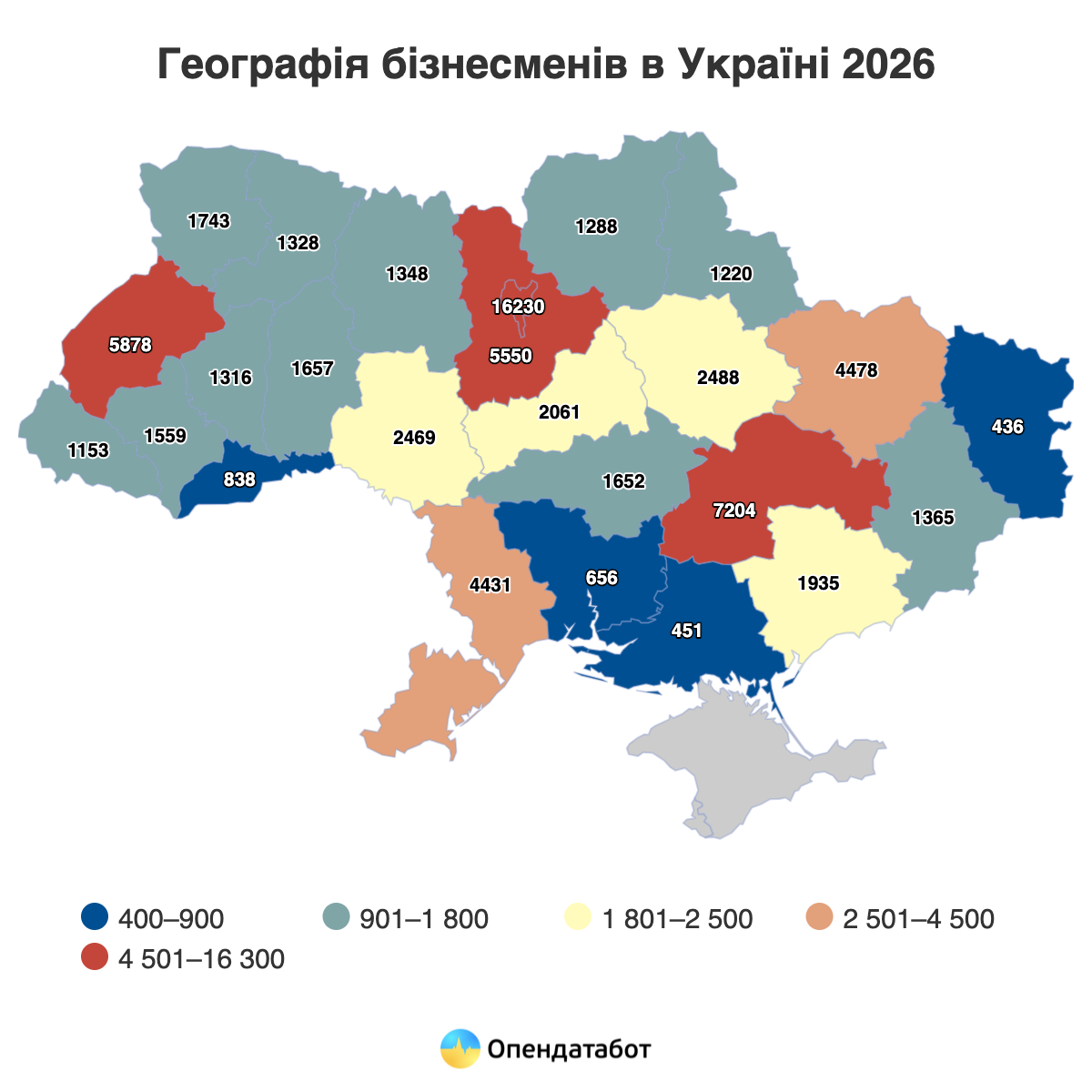 Почти четверть всех бизнесменов зарегистрированы в Киеве — 16 230. За ним следуют Днепропетровская область (7 204 бизнесмена) и Львовская область (5 878). Вместе на эти 3 региона приходится около 40% всего крупного бизнеса страны.