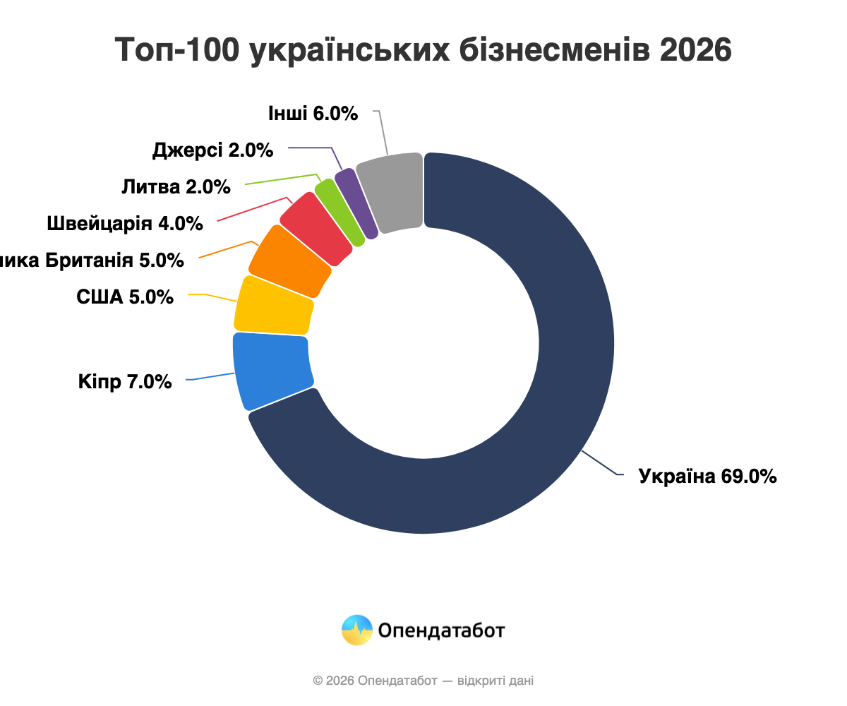 69 владельцев бизнеса из сотни лучших прописаны в Украине. Также в списке есть представители Кипра (7%), США и Великобритании (по 5%), Швейцарии (4%) и других стран, включая ОАЭ, Германию и Монако.