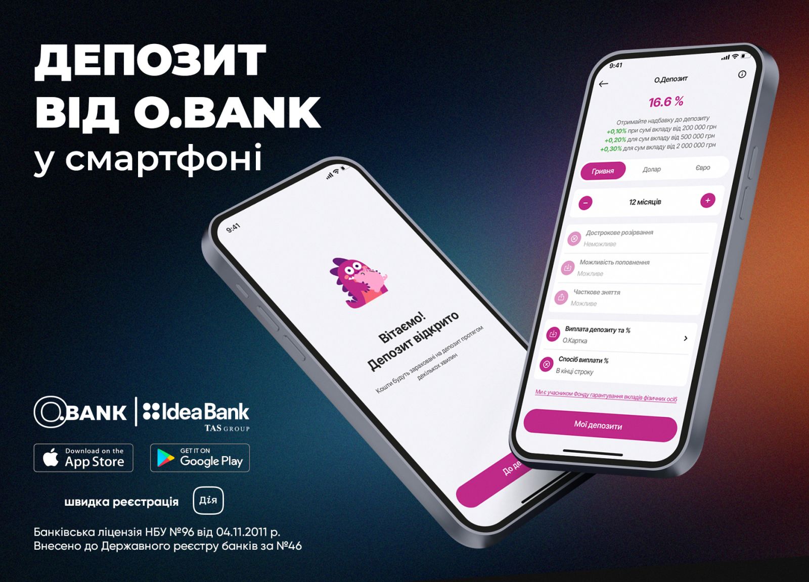 У мобильного O.Bank, который предоставляет доступ к депозитным продуктам АО «Идея Банк», весной 2026 года одно из самых сильных предложений в подборке. В линейке есть сразу несколько продуктов, на которые стоит обратить внимание: «На старт» со ставкой 17% годовых сроком на 100 дней и 6 месяцев, «О. Депозит» — 16,90% годовых сроком от 1 до 18 месяцев, и «Для своих» — от 7,5% до 16,80% годовых, в зависимости от срока, формата выплаты процентов и надбавок. Есть в продуктовой линейке и более гибкие решения — например, вклад «Свободные средства» до востребования под 5% годовых, который допускает пополнение и частичное снятие в пределах неснижаемого остатка, а также депозит «Вместе к победе» на 100 дней под 12% годовых с возможностью пополнения на сумму от 1 000 грн. Таким образом, O.Bank/Идея Банк покрывает сразу несколько сценариев пользования деньгами — от максимальной доходности до сохранения доступа к части денег.