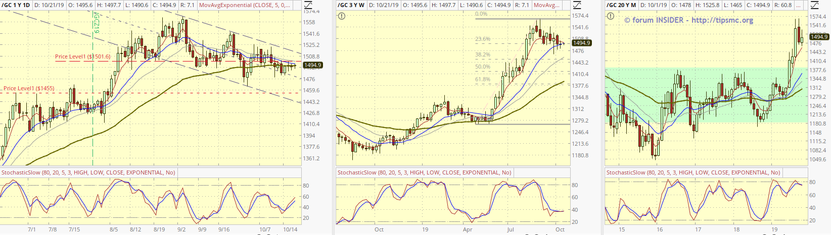 «Мне по-прежнему „не хватает“ коррекции в золоте к 38-му ФИБО. И сейчас вероятность такой коррекции как никогда высока. Но есть один нюанс. Для падения цены золота к прайсу 1450(55) usd, недельная свеча должна пробить сильную поддержку в виде сигнального (signal WMA) мувинга. А этого пока не произошло, риски внезапного роста актива сохраняются.» — это я написал в прошлом обзоре. И знаете, добавить нечего. Кроме того, что в случае форс-мажорных новостей, технически покупать золото можно. Впрочем, на неделях образовался треугольник и, похоже, выход из него и сможет предопределить направление движения. «Ждем вспышек памяти или сведений со стороны...» © Жванецкий.