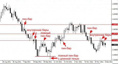 В примере ниже дневной график GBPUSD включает данные последних 4 месяцев. На нем выделены очевидные ключевые уровни поддержки и сопротивления, а также сигналы price action, которые сформировались вблизи этих уровней.