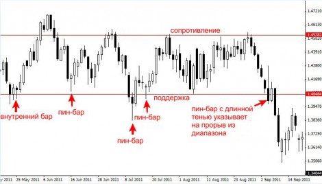 Стоит обратить внимание, что как раз перед прорывом вниз из диапазона пин-бар с длинной тенью просигнализировал о выходе из диапазона, и после него последовало значительное движение вниз.