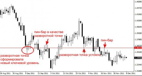 Цена отскочила от этого уровня несколько раз, образуя четкие пин-бары, что впоследствии вылилось в значительные направленные движения.